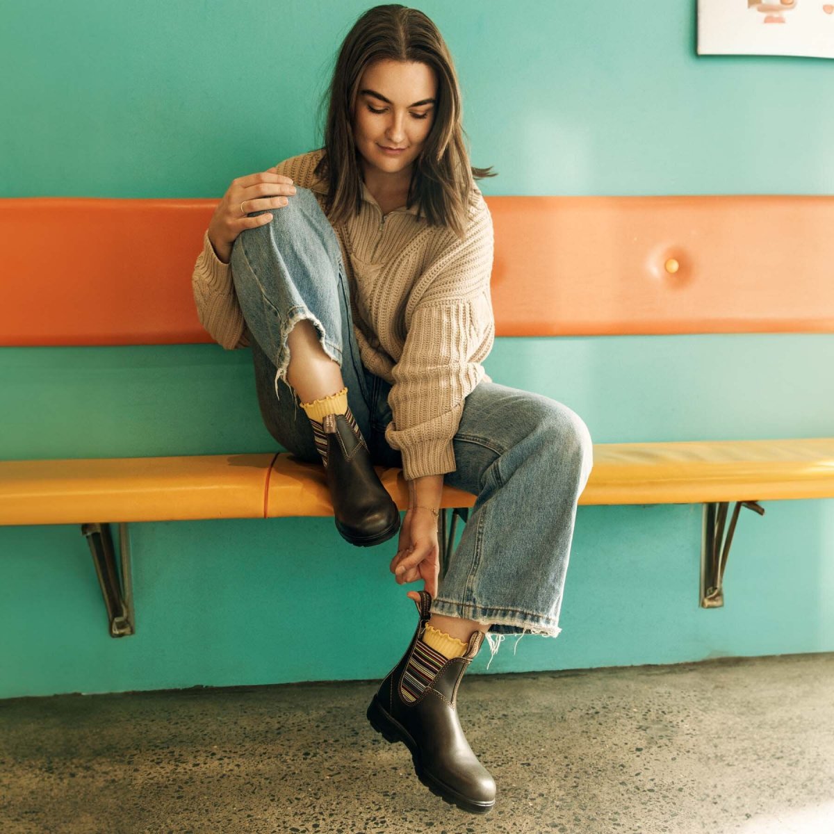 El botín Blundstone #1409 destaca por su diseño clásico y el toque elegante que le dan las bandas elásticas a rayas de colores. Están confeccionados en piel lisa marrón oscuro resistente al agua. Dotados de una lengüeta delantera y trasera para un ajuste fácil, suela de goma dentada antideslizante con talón elevado. Un botín ideal para añadir un toque de estilo a tus conjuntos.